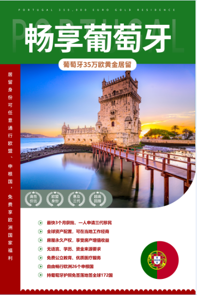 最快3个月获批,一人申请二代移民,全球资产配置,可在当地工作经商房屋永久产权,享受房产增值收益。无语言,学历,资金来源要求。免费公立教育,优质医疗服务,自由畅行欧洲26个申根国家,持葡萄牙护照免签落地全球172国家。