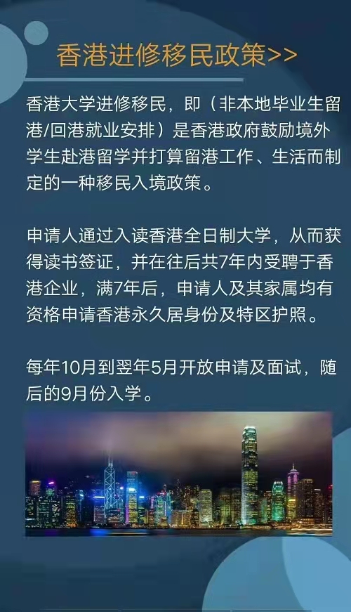 香港大学进修移民,即(非本地毕业生留港/回港就业安排)是香港政府鼓励境外学生赴港留学并打算留港工作、生活而制定的一种移民入境政策。