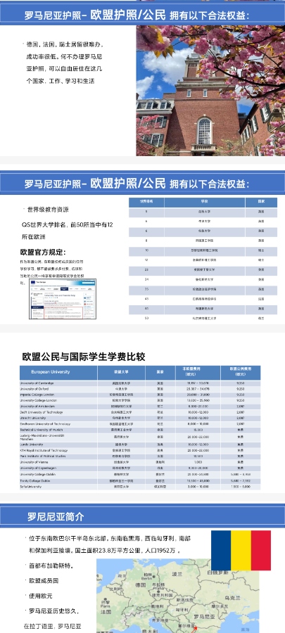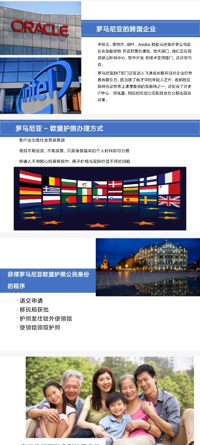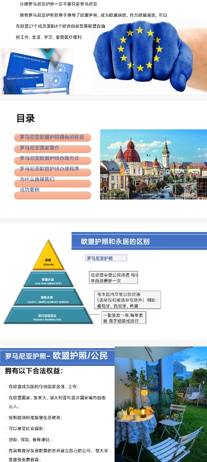 一步到位办理欧盟国家罗马尼亚护照,发达国家中除了美国不免签,其他国家都免签。可以申请直系亲属,全过程在全球任何一个罗马尼亚使领馆办理(包括北京上海都是可以的)。办理是周期5个月以内。那办理方式呢就是客户走的是社会贡献类别,不需要投资,不需要买房,只需要准备简单的个人材料即可办理,申请人不用担心购房移民中,房子价格与实际价值不符的问题。
