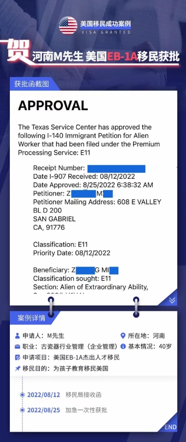 恭喜河南M先生今日EB1-A杰出人才移民获批